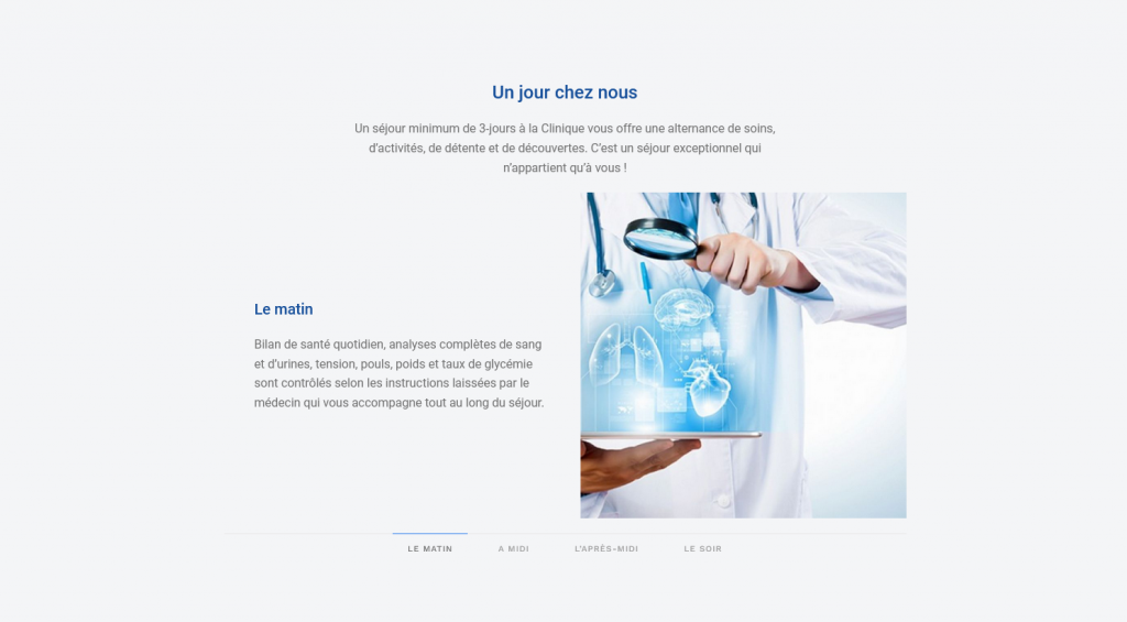 À la pointe des dernières technologies avec une approche holistique de nos programmes, supervisée par une équipe pluridisciplinaire à l’écoute quotidienne de ses patients, nous offrons une prise en charge médicale globale 24/24 heures tant sur le plan de la santé physique que de l’équilibre mental.